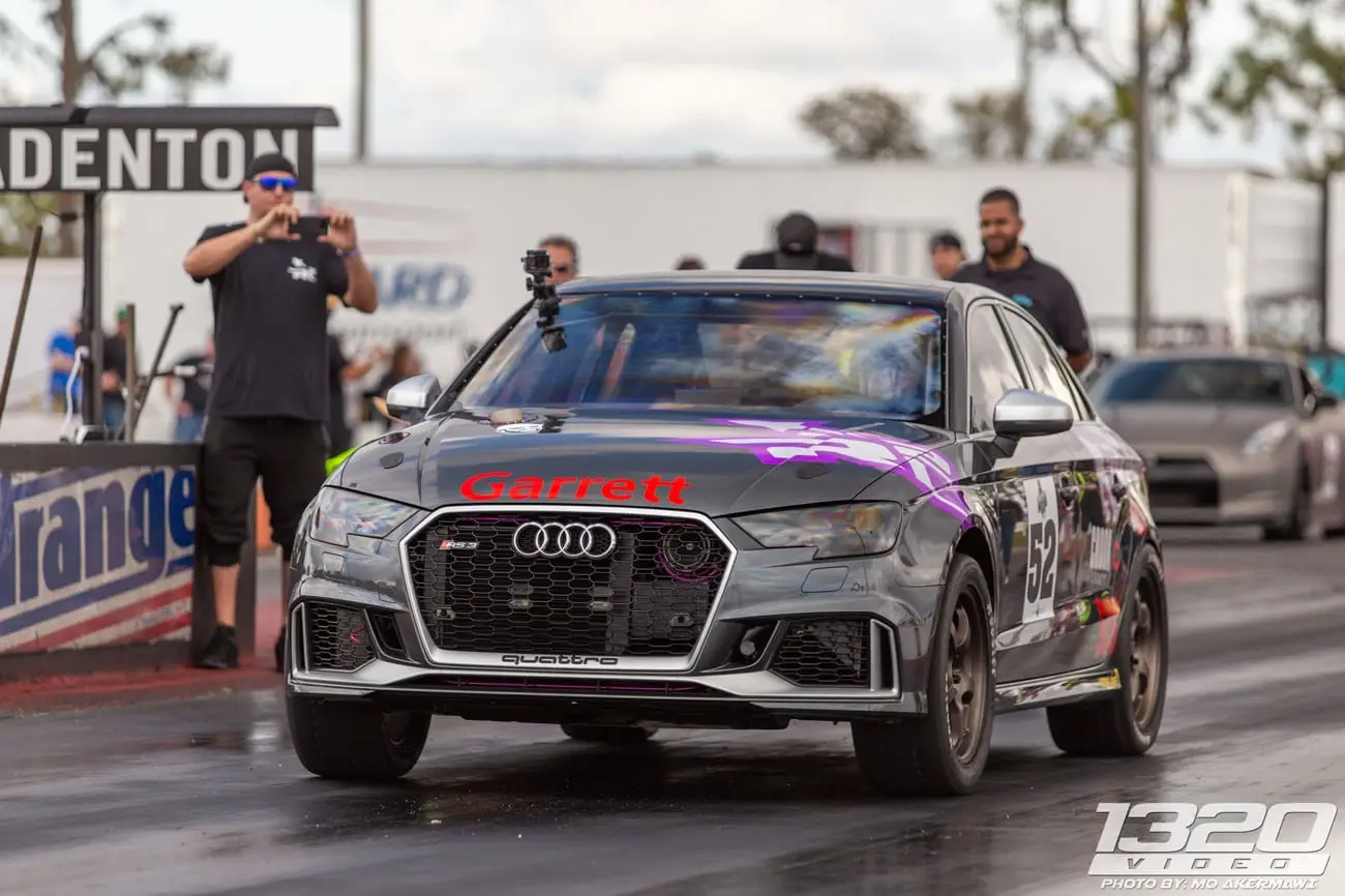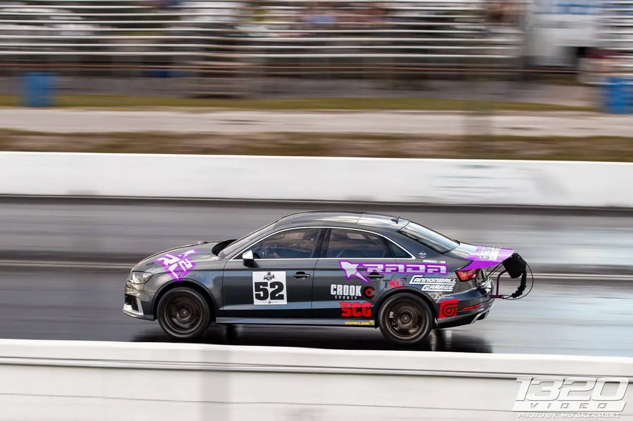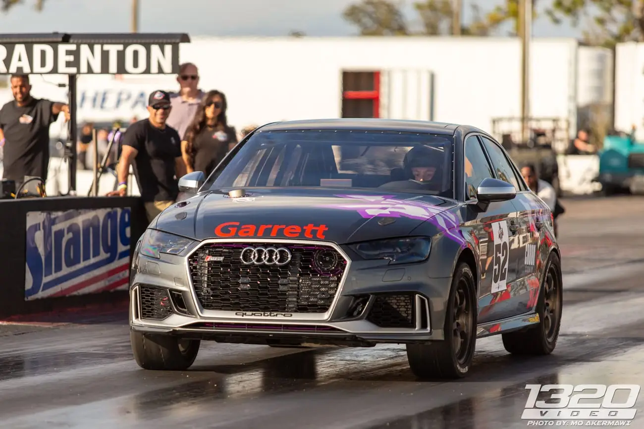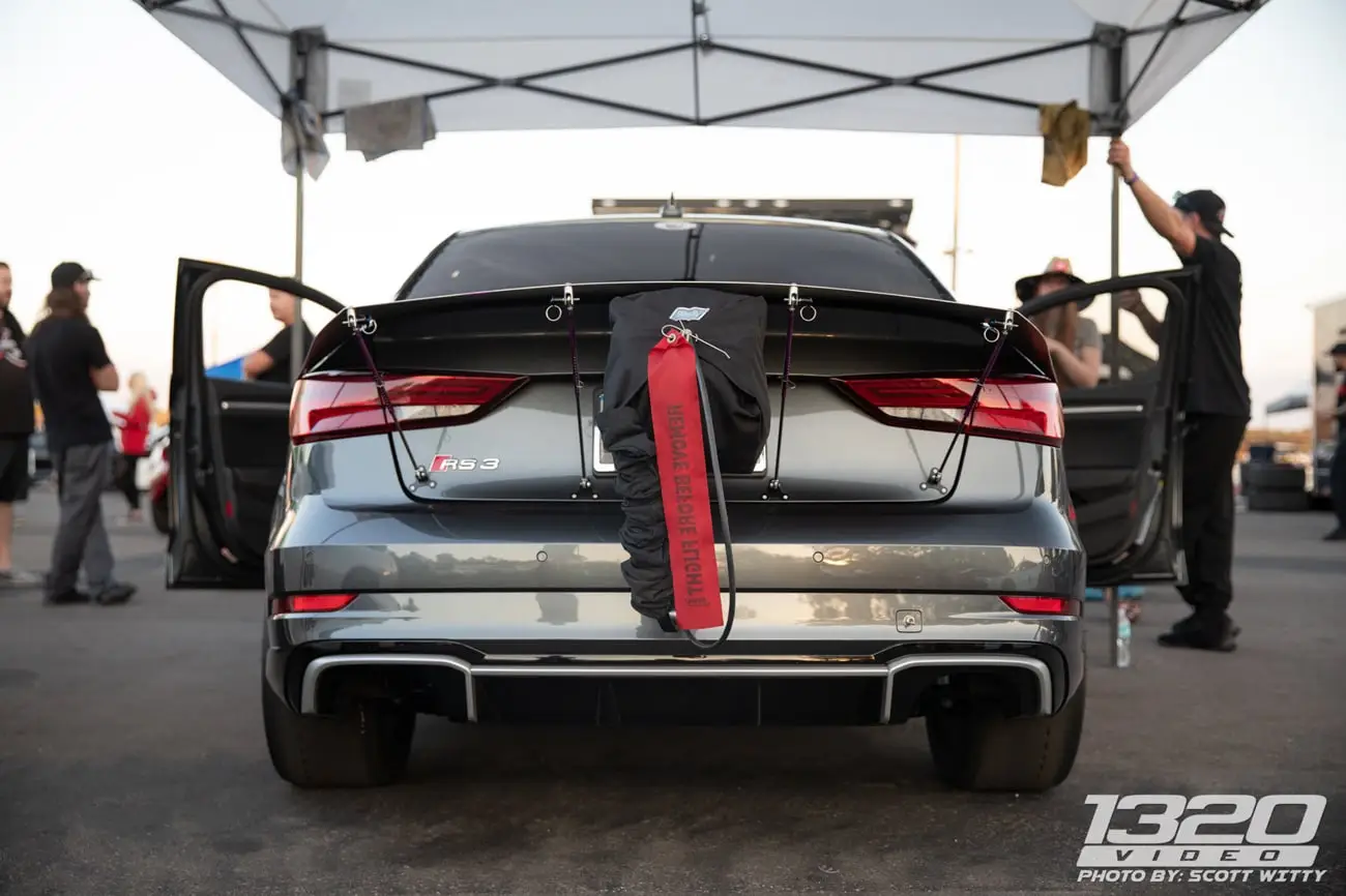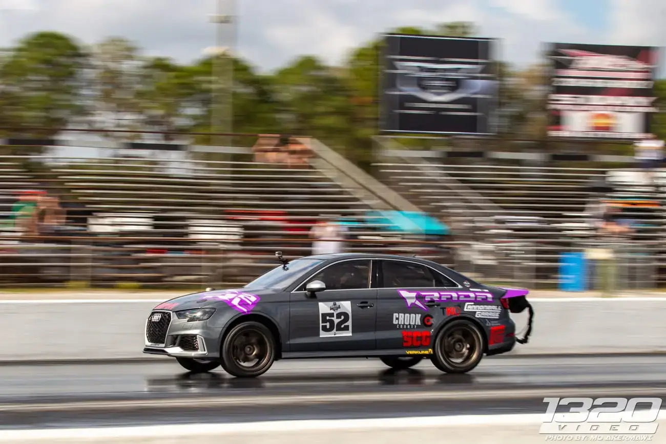 Every aspect of Kyle’s Audi RS3 was worked over – from a fully built motor, custom fabrication work on the turbo kit, air-water intercooler, custom chromoly roll cage, parachute mount, custom carbon/carbon drag brakes, built twin clutch transmission, mil-spec wiring harness and more.