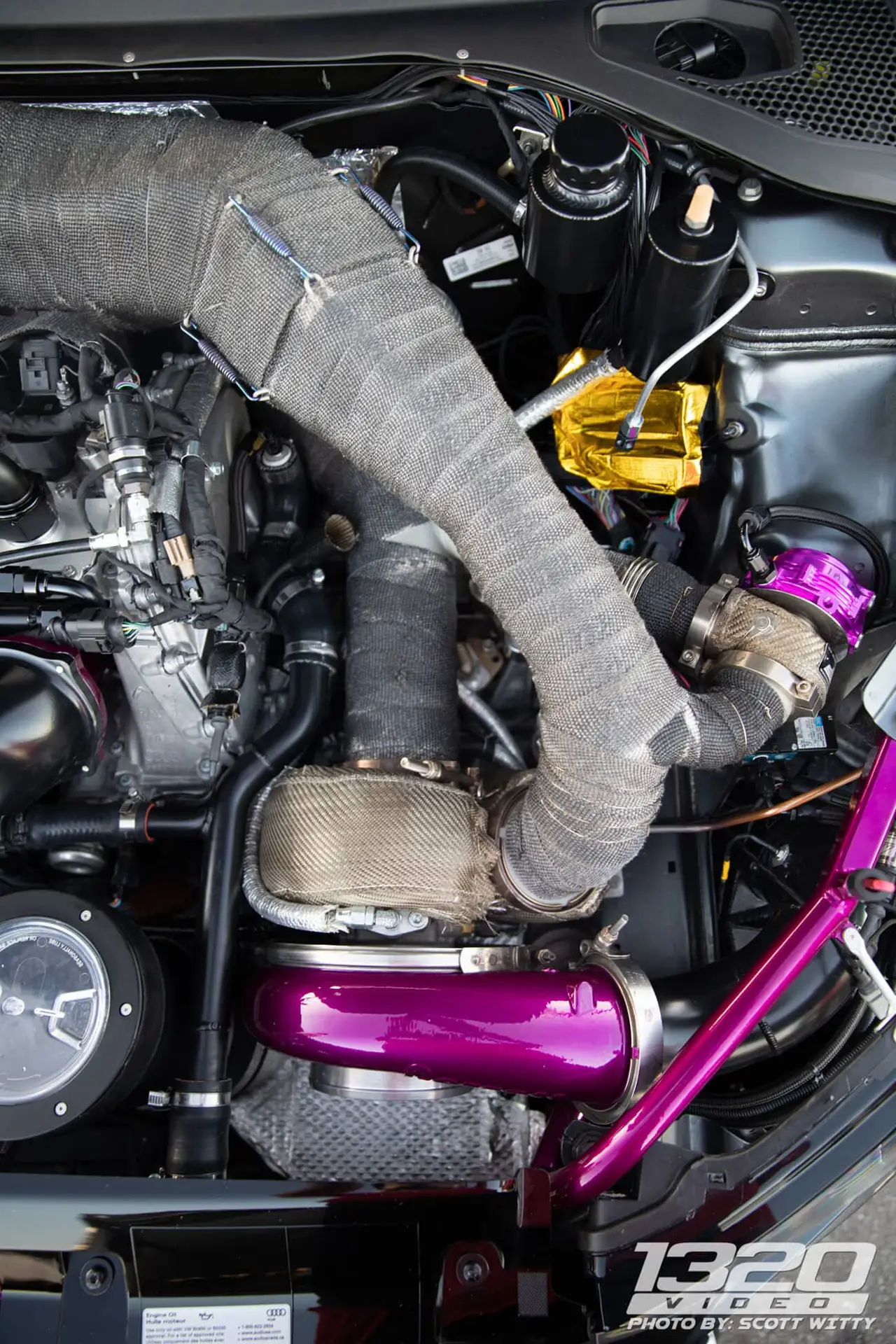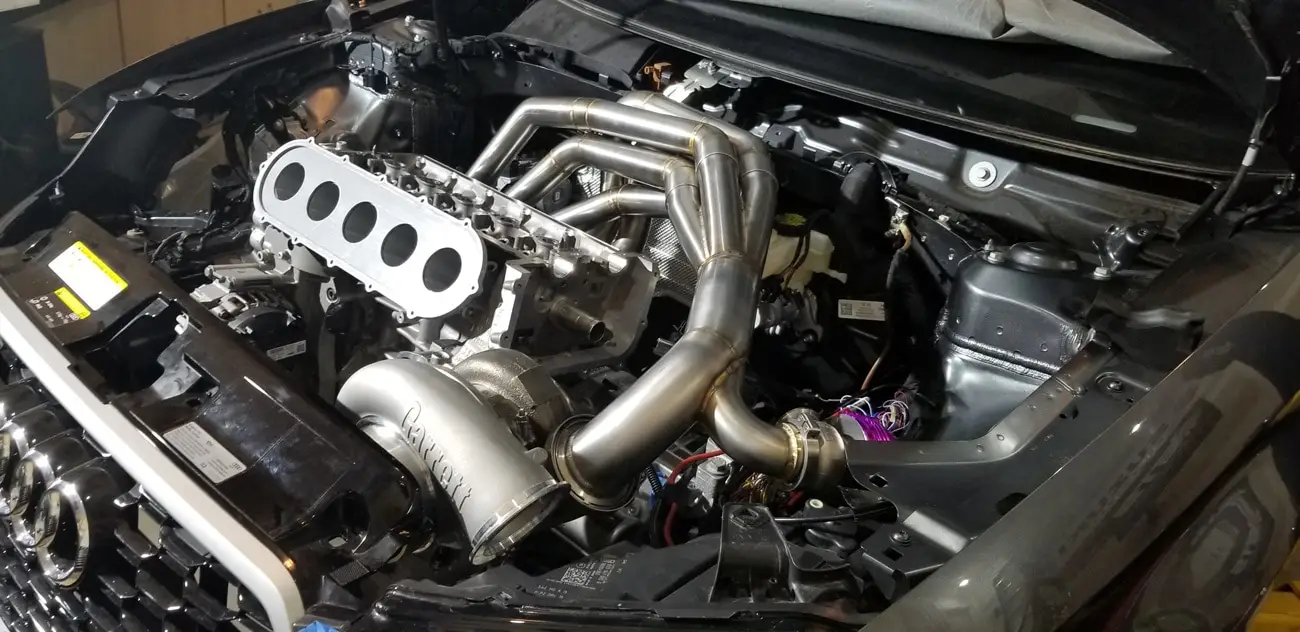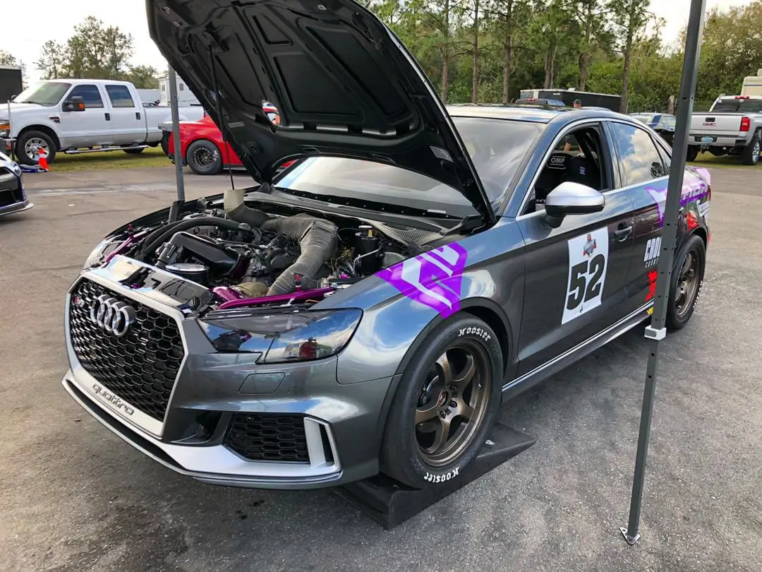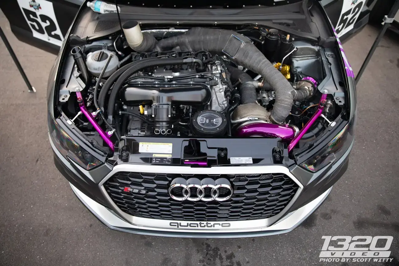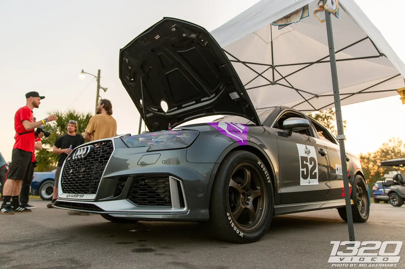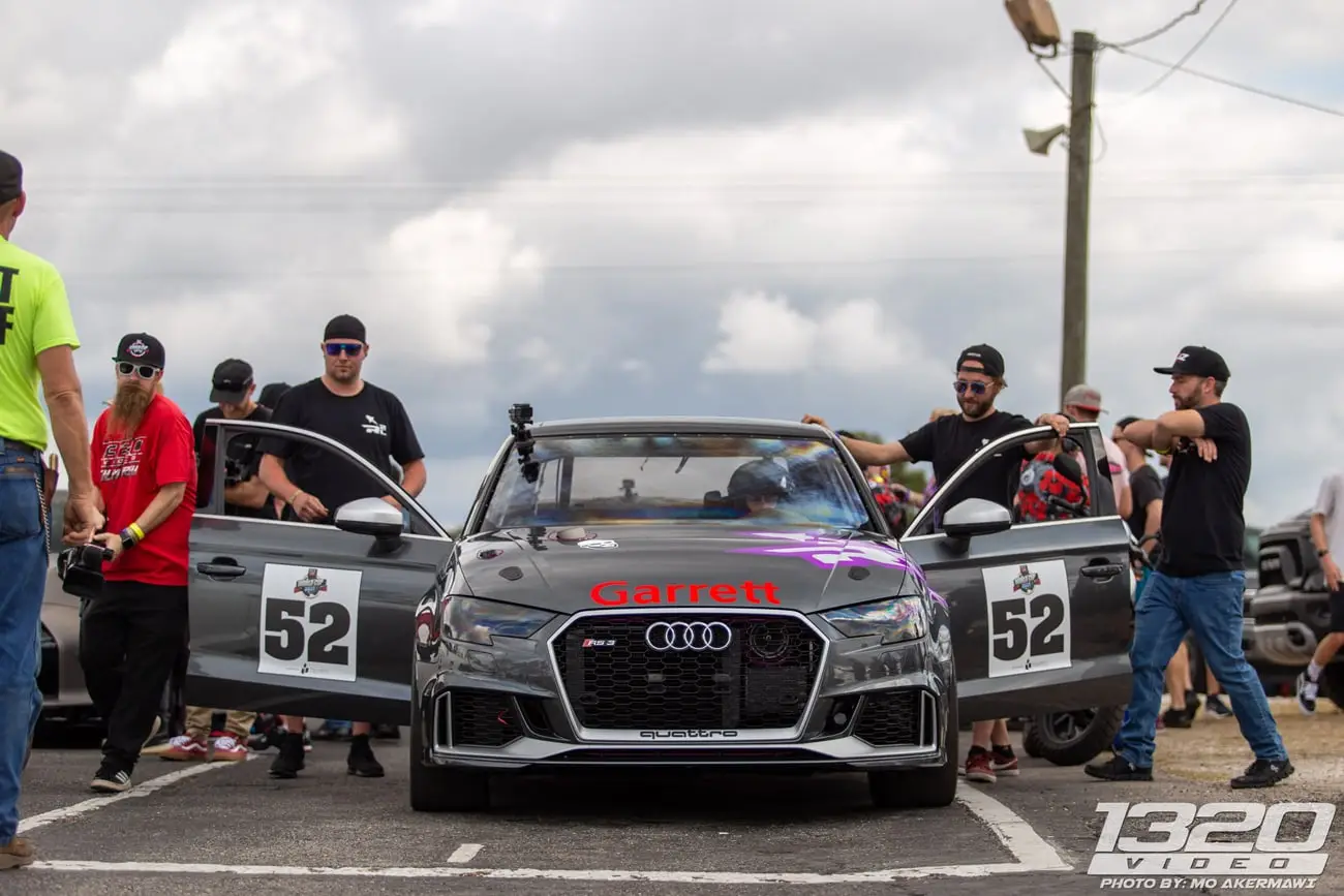Every aspect of Kyle’s Audi RS3 was worked over – from a fully built motor, custom fabrication work on the turbo kit, air-water intercooler, custom chromoly roll cage, parachute mount, custom carbon/carbon drag brakes, built twin clutch transmission, mil-spec wiring harness and more.