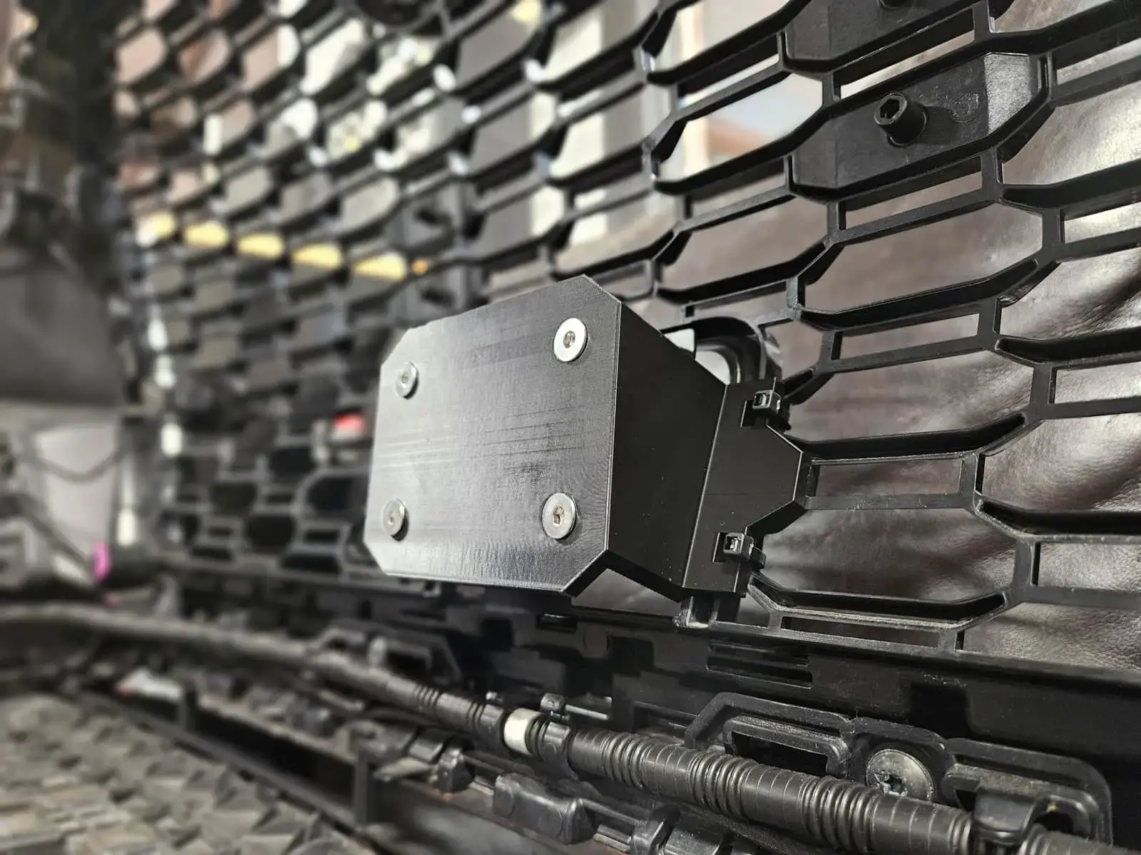 - The bracket quickly and simply installs with cable ties to the honeycomb grill of the RS3.